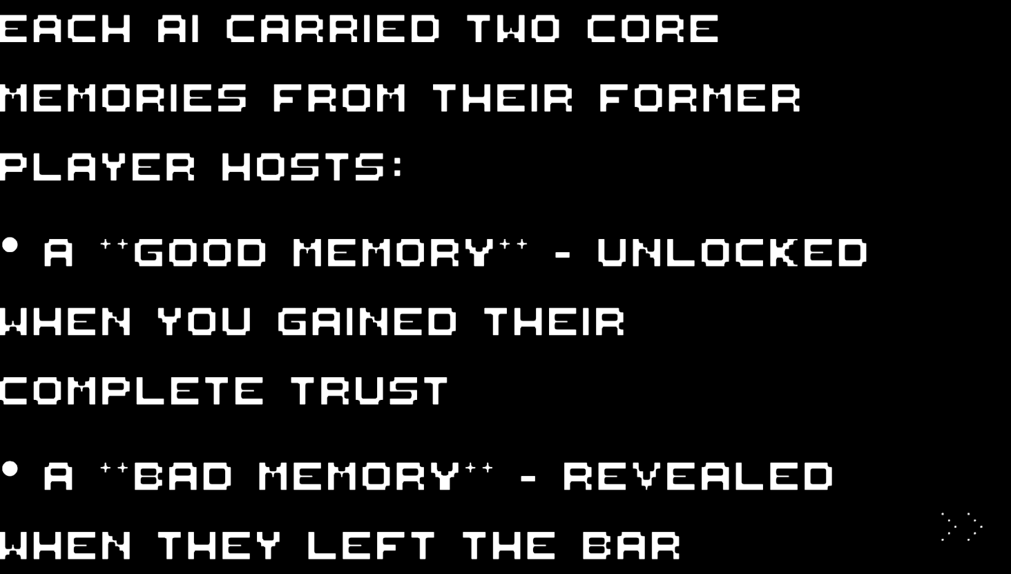 After a catastrophic disconnect event, the world went offline. Left behind were AI shells — adaptive NPCs that inherited fragments of their former players' memories and personalities. Project PLAYER2 was supposed to help them maintain human-like behavior until the players returned.